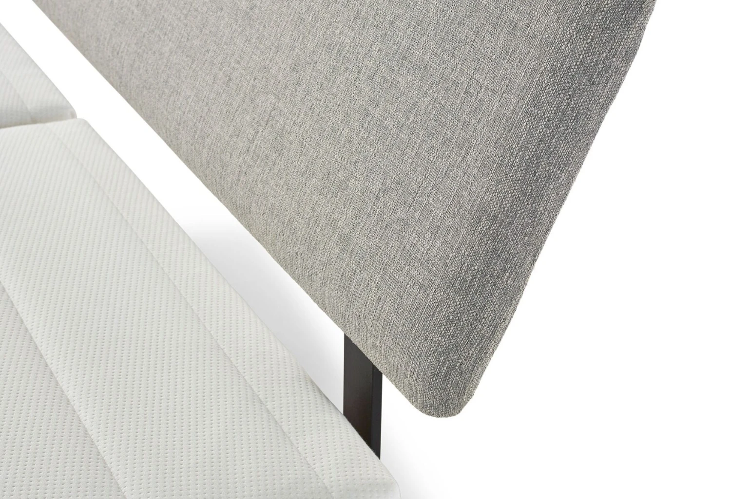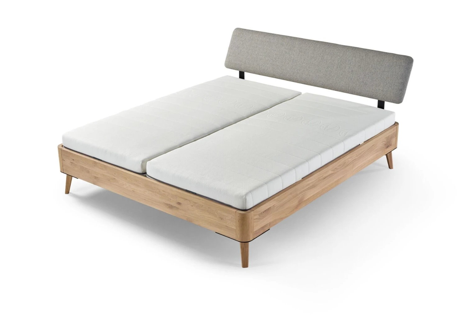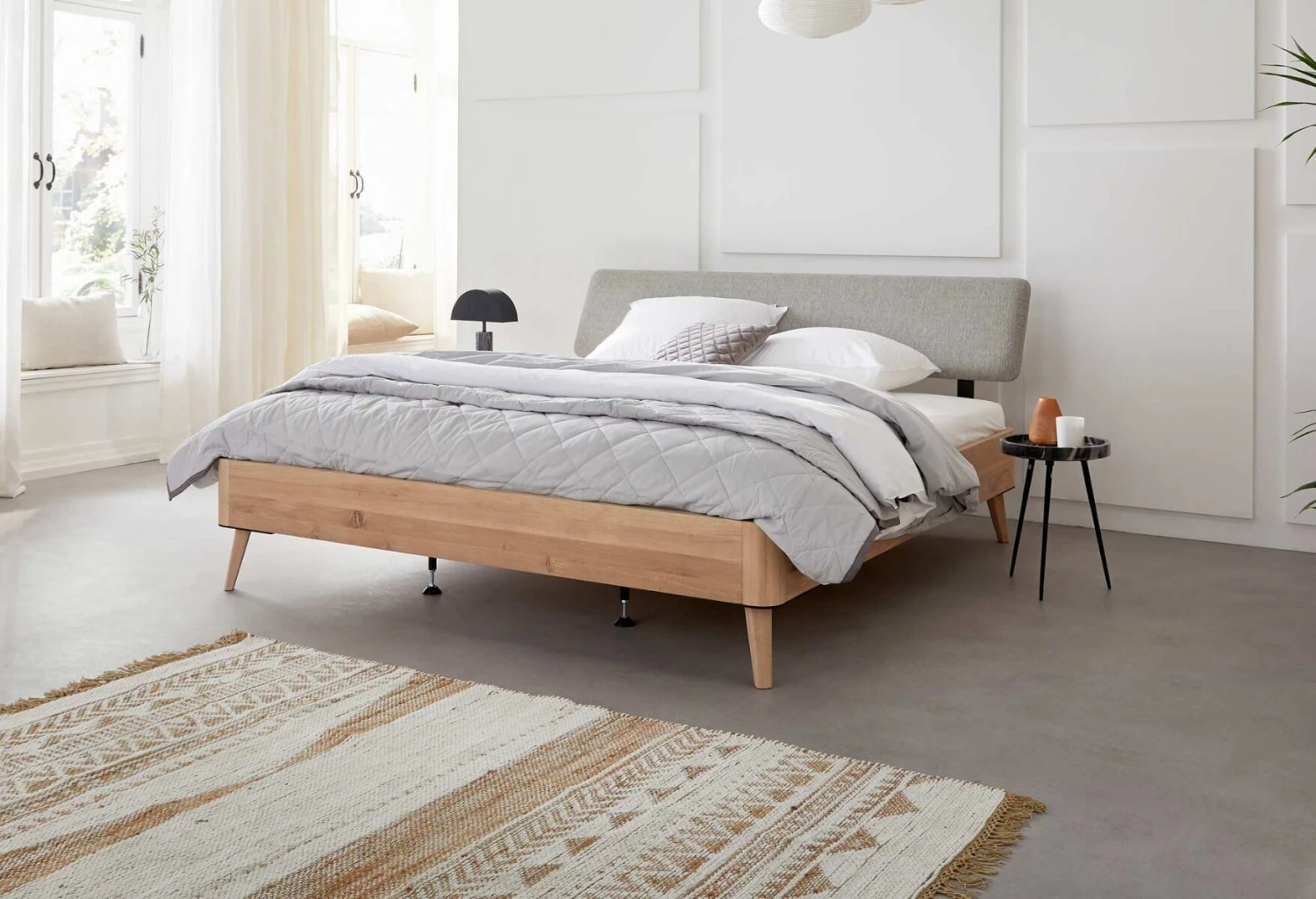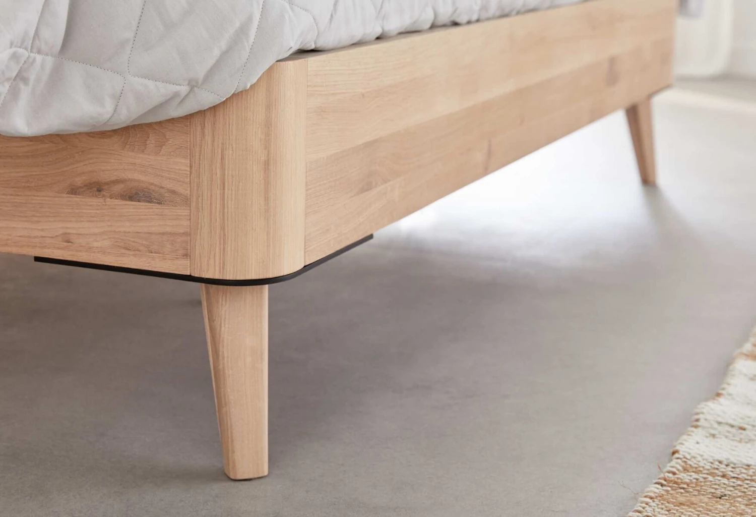 Bedframe Balance Gentle kenmerkt zich door ronde vormen en een unieke combinatie van materialen. Het optionele hoofdbord is zwevend en gestoffeerd en rust op een houten frame met zwart metalen details.