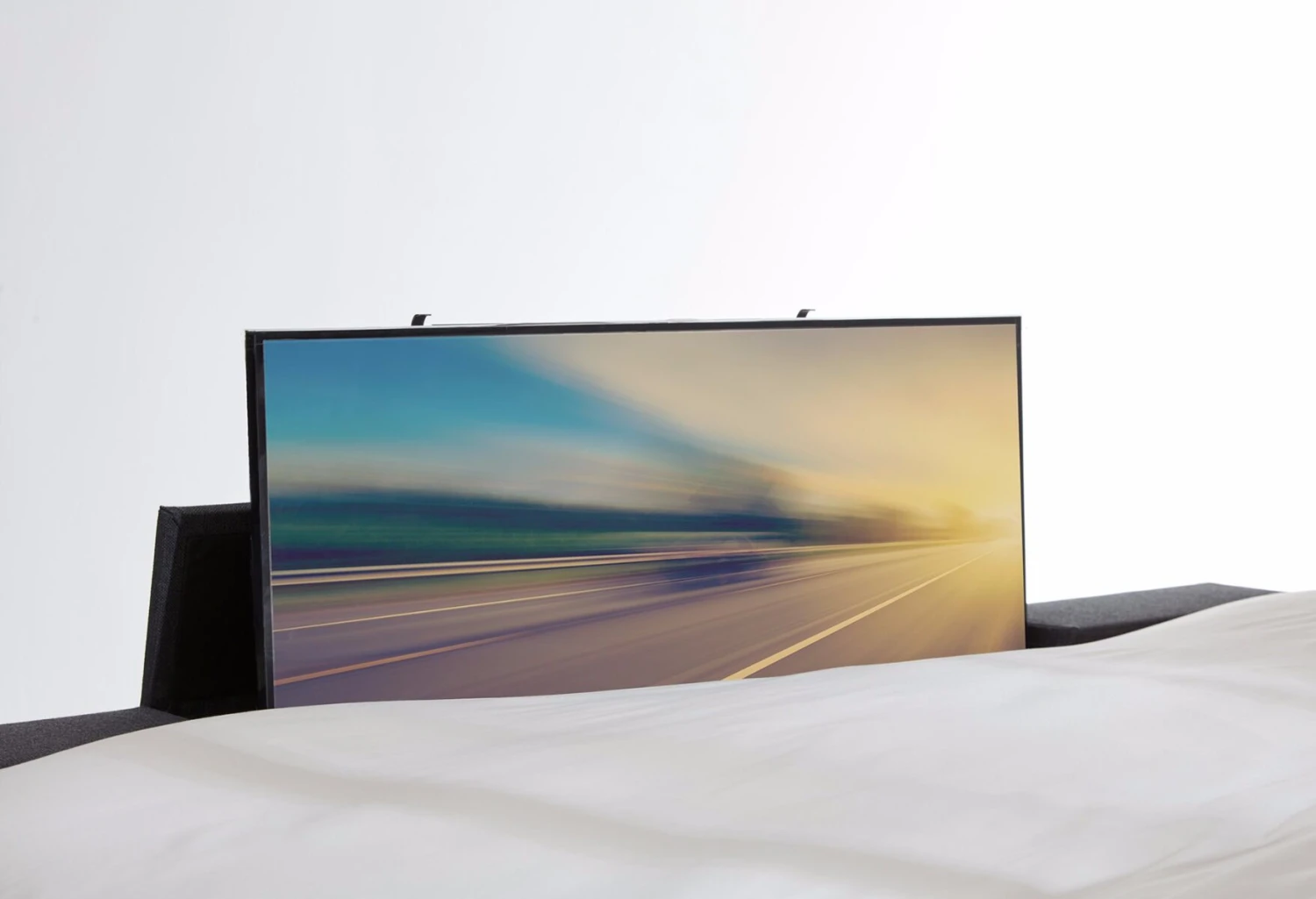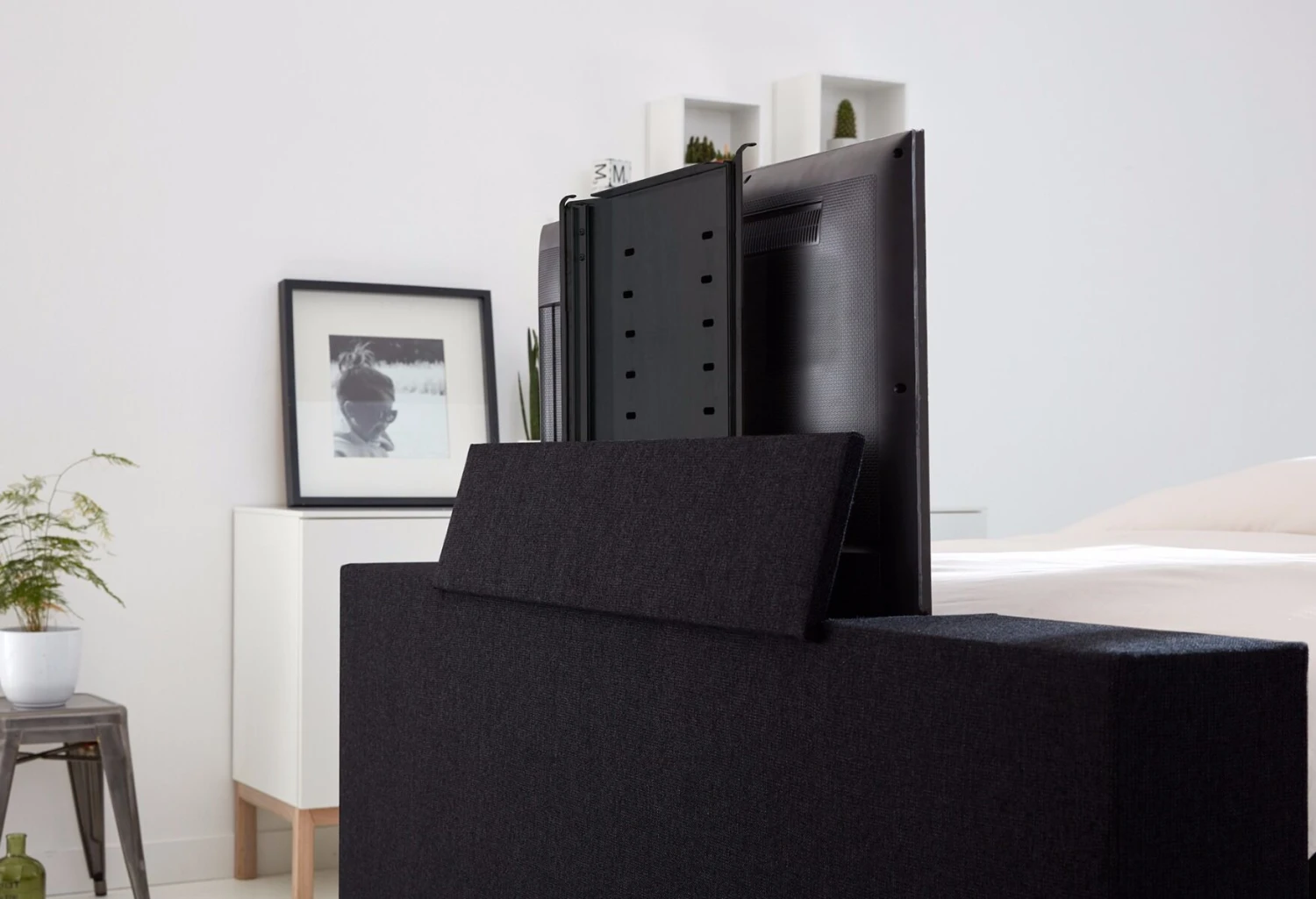 Geniet nog meer van jouw nieuwe boxspring dankzij de stijlvol ingebouwde tv-lift in het voetbord.