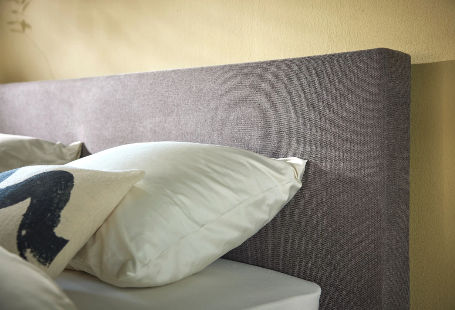 Het effen hoofdbord en de neutrale, geweven stof geven Boxspring Home 406 een tijdloze uitstraling.